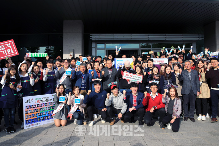 사진설명:롯데그룹은 15일(일), 건국대학교 서울캠퍼스(광진구 소재)에서 52개 계열사 1,600여 명의 직원들을 대상으로 간부승진 자격시험을 진행했다. 사진은 롯데지주황각규 대표이사(가운데)와 각계열사 대표이사, 롯데선·후배 동료임직원들이 수험생들을 응원하는 모습.