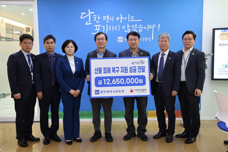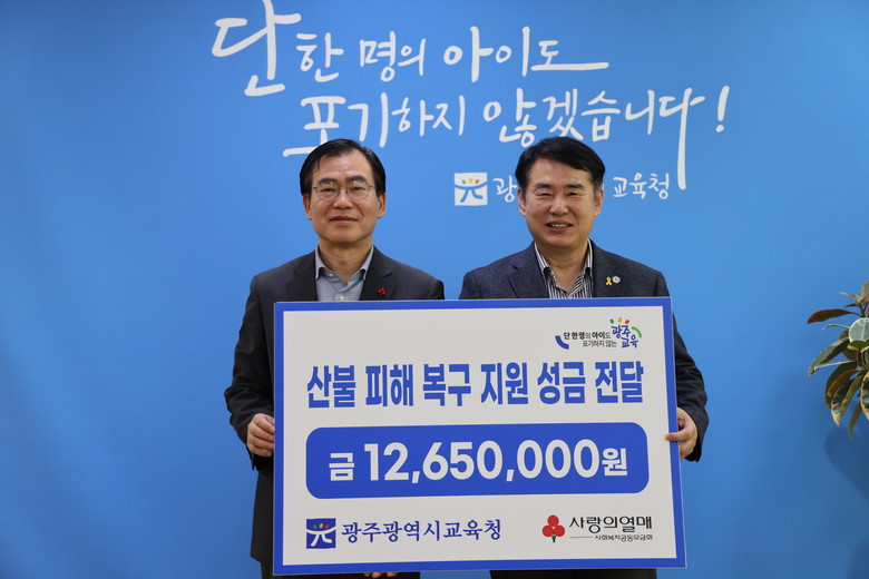 [광주 세계타임즈=손권일 기자] 광주광역시교육청(교육감 이정선)은 18일 본청 교육감실에서 직원들이 모금한 산불 피해 복구 지원 성금 1천265만원을 ‘사랑의 열매’(사회복지공동모금회)에 전달했다.