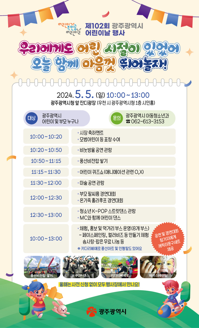 행사는 마술·비눗방울 공연, 강기정 시장과 풍선비전탑 쌓기, 온가족 훌라후프 경연대회 등이 진행되며, 다양한 체험부스를 무료로 이용할 수 있다.