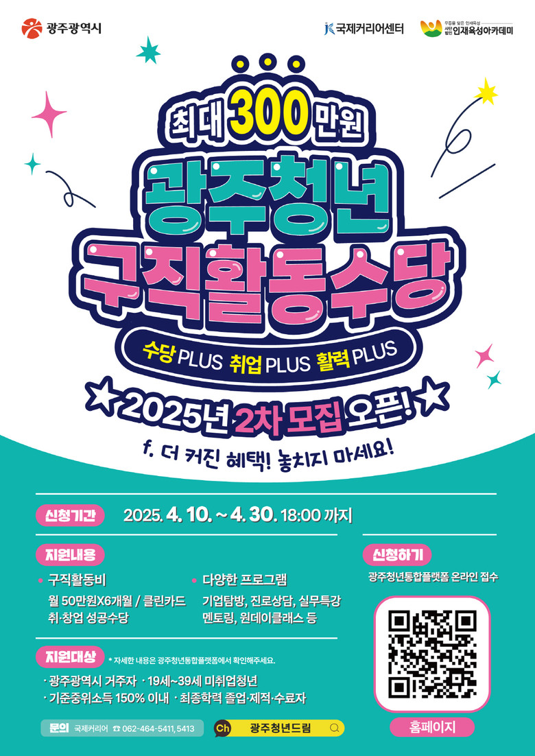 - 구직프로그램 제공…취·창업 성공 때 성공수당 지급도 [광주 세계타임즈=손권일 기자] 광주광역시(시장 강기정)는 ‘2025년 광주 청년구직활동수당 지원’ 2차 참여자 830명을 10일부터 30일까지 모집한다.