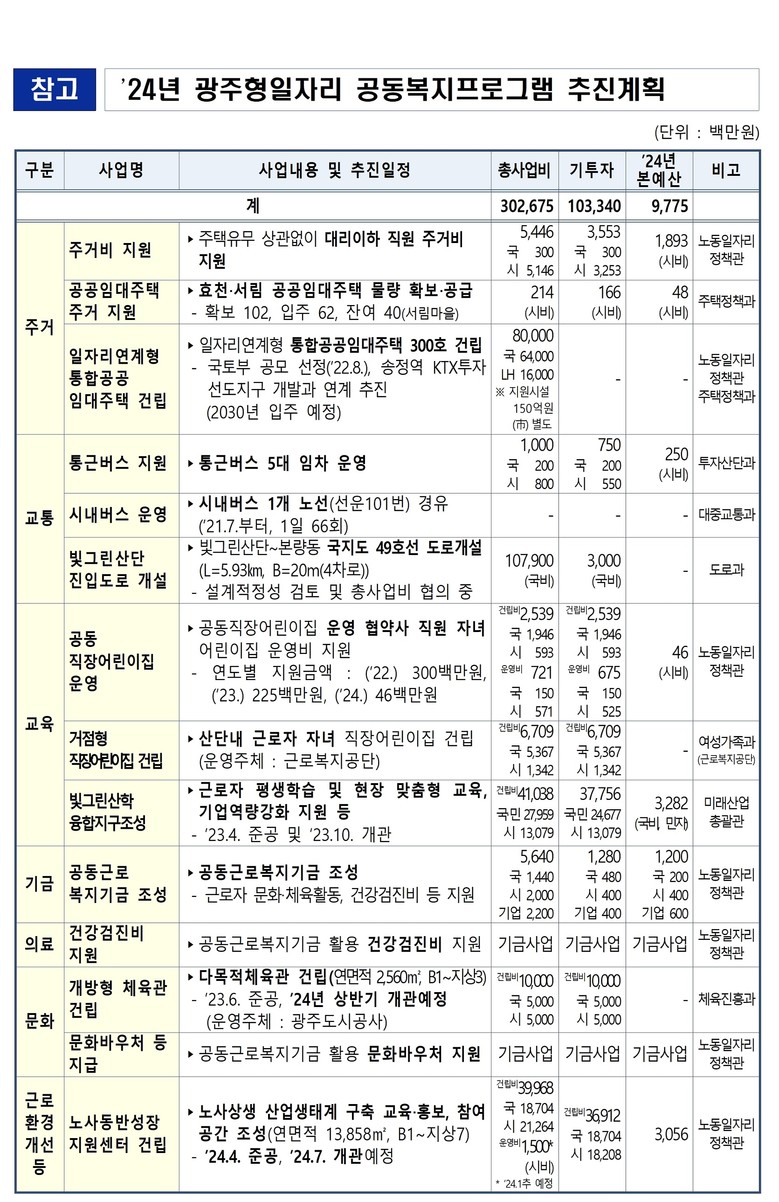 광주시는 그동안 공동복지프로그램을 통해 주거비 지원, 효천‧서림 공공임대주택 입주 지원, 통근‧시내버스 운영, 산단내 어린이집 운영 등 14개 사업에 1029억원을 투입했다.