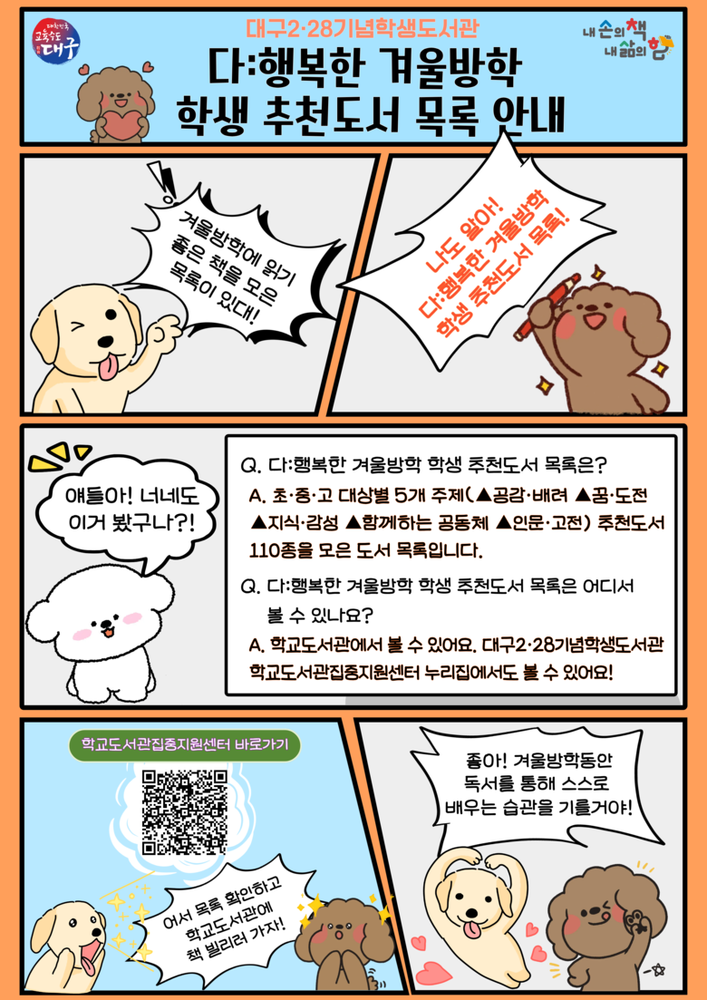 아울러, 국립어린이청소년도서관이 선정한 2025~2026년 겨울 독서교실 추천도서 가운데 교육적 가치와 흥미 요소를 갖춘 유아·초등·청소년 분야 도서 48종을 함께 수록해, 가정과 학교에서 체계적인 독서 지도가 이루어질 수 있도록 했다.