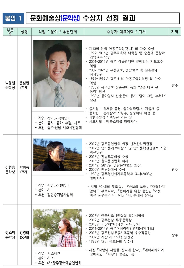 광주시는 앞서 지난 2일 광주문화예술상 문학분야 심사위원회를 열어 박용철·김현승·정소파 문학상 수상자로 이들 세 작가를 각각 선정했다. 수상자에게는 문화예술창작지원금 1000만원과 광주시장상 상패가 수여된다.