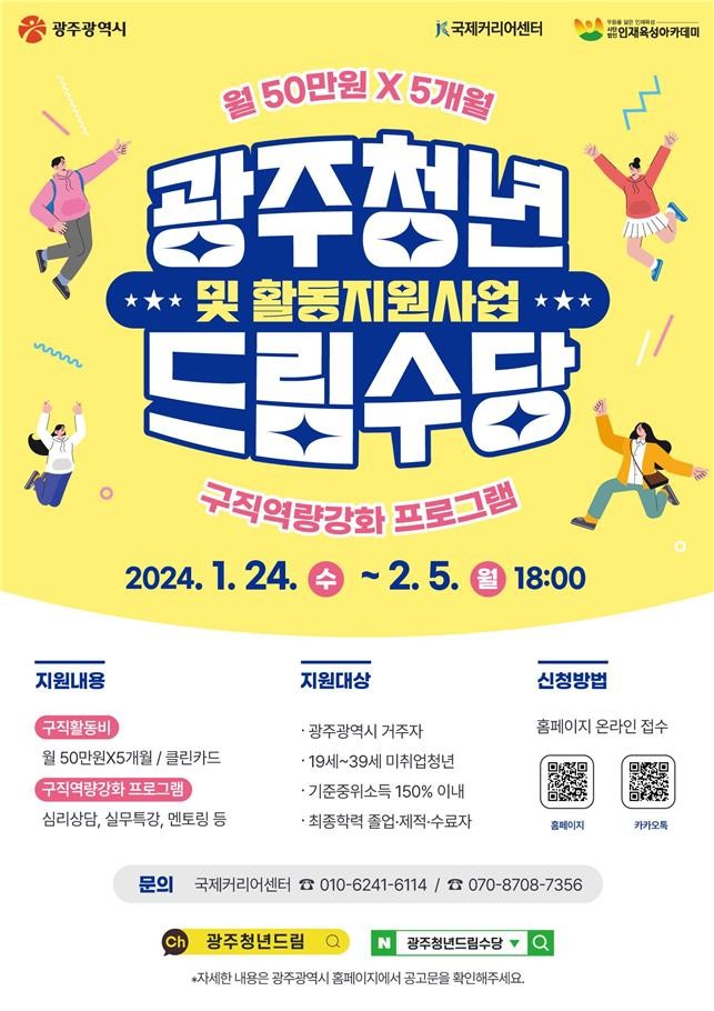 광주광역시(시장 강기정)는 미취업 청년의 지역사회 진입을 돕고 구직활동에 필요한 경비를 지원하기 위해 ‘2024 광주청년드림수당 및 활동지원사업’을 추진한다.