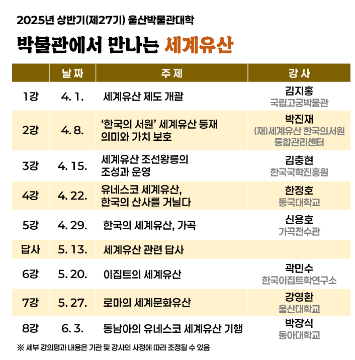 강의 일정은 △4월 1일 김지홍 국립고궁박물관 사무관의 세계유산 제도 개괄을 시작으로, △4월 8일 박진재 (재)세계유산 한국의서원 통합관리센터 기획조정실장의 ‘'한국의 서원' 세계유산 등재 의미와 가치 보호’, △4월 15일 김충현 한국국학진흥원 전임연구원의 ‘세계유산 조선왕릉의 조성과 운영’, △4월 22일 한정호 동국대학교 교수의 ‘유네스코 세계유산, 한국의 산사를 거닐다’가 진행된다.