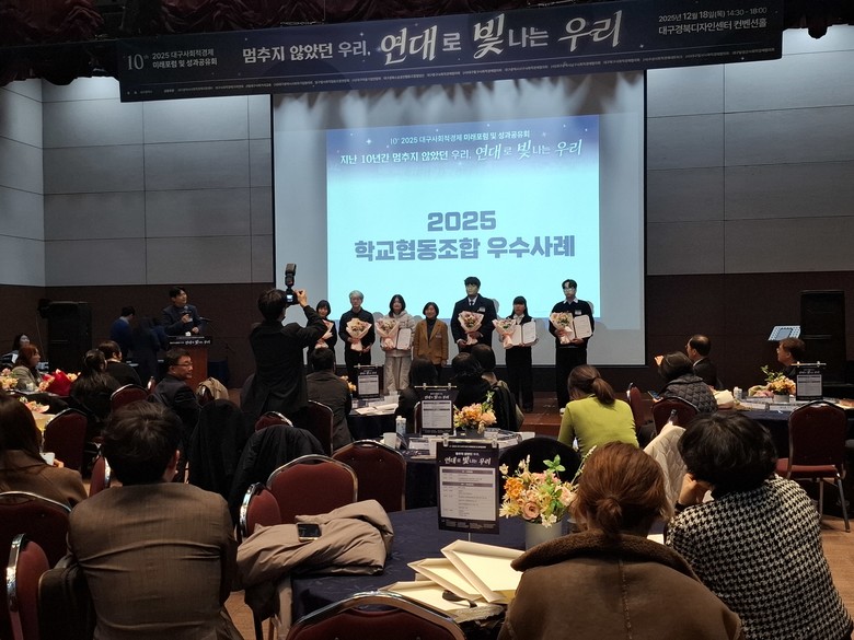 [대구 세계타임즈=한윤석 기자] 대구해올고등학교(교장 박은지)는 12월 18일(목), 대구경북디자인센터에서 개최된 ‘2025 대구 학교협동조합 사례공모전’ 시상식에서 체험사례 부문에 3학년 이민정 학생이 최우수상, 3학년 박서현 학생이 우수상을 수상하는 영예를 안았다고 밝혔다.