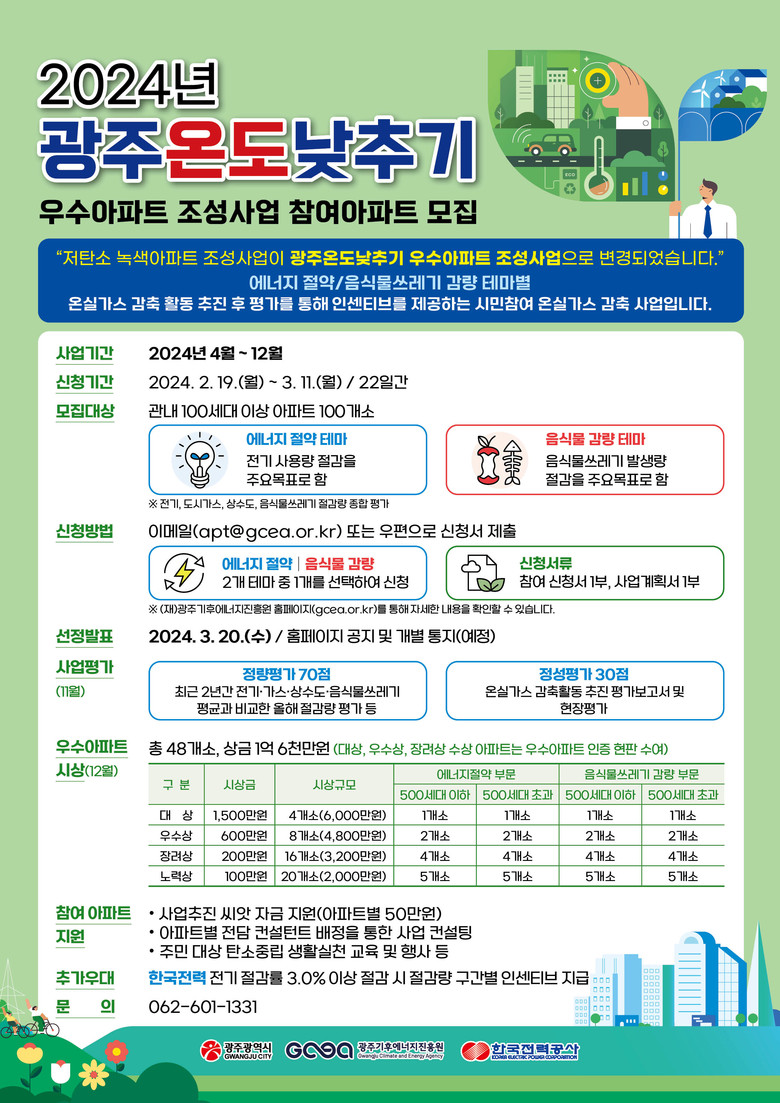 - 우수아파트 48곳 선정…총 1억6000만원 상금·인증현판 제공 [광주 세계타임즈=손권일 기자] 광주광역시(시장 강기정)는 온실가스 감축 생활 실천사업인 ‘광주온도낮추기 우수아파트 조성’에 참여할 아파트를 오는 3월 11일까지 모집한다.