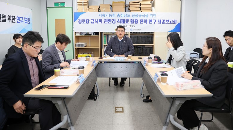 도의회 ‘공공급식 활성화 방안 마련을 위한 연구모임(대표 김기서)’이 2일 국립공주대학교 예산캠퍼스 산업과학관 세미나실에서 제3차 회의 및 연구용역 최종보고회를 열고, 충남형 경로당 공공급식 모델 구축 방안을 최종 점검했다.