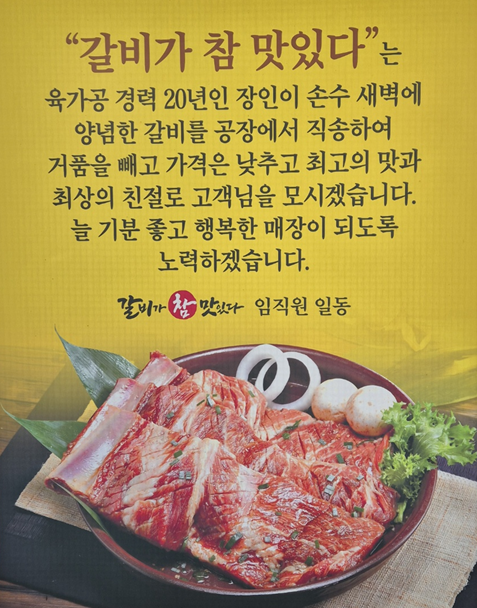 이 집에서 맛보는 갈비의 쫀득한 식감과 맛의 비결은 육가공 장인이 손수 새벽에 양념한 갈비를 공장에서 직송하여 거품을 빼고 가격은 낮추고 최고의 맛을 자랑하고 있다.이뿐인가 친절로 고객을 모시는 것을 알 수 있었다.