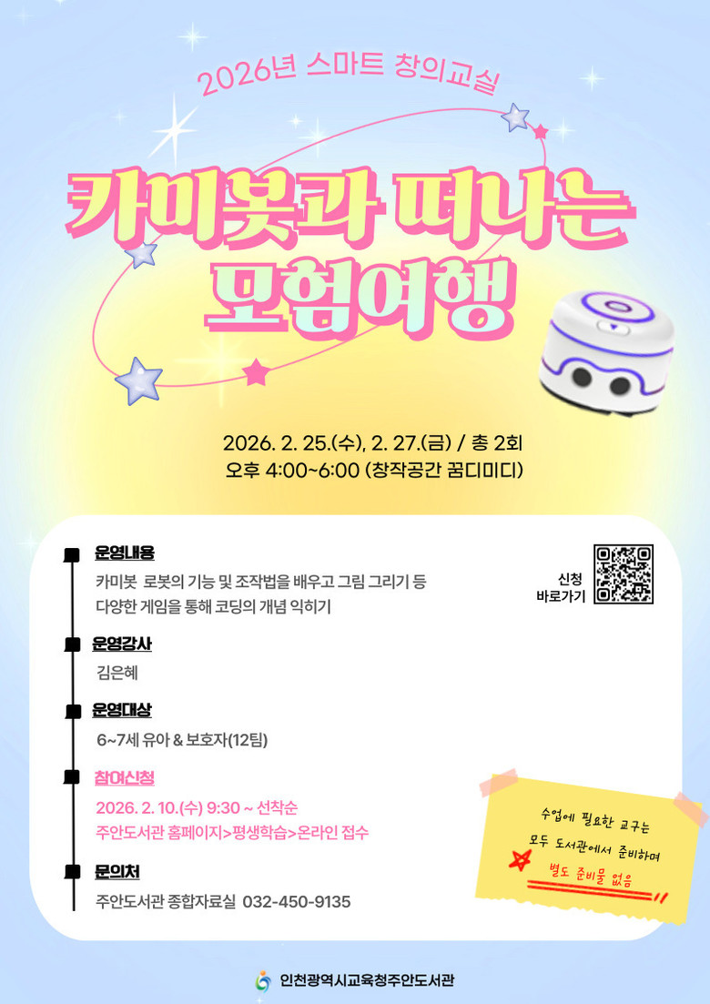 참여 신청은 2월 10일 오전 9시 30분부터 주안도서관 누리집에서 가능하며, 수업에 필요한 교구는 도서관에서 지원한다.