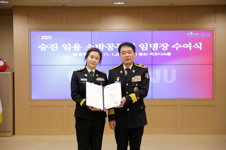 광주소방안전본부는 최근(11월1일) 시청 비즈니스룸에서 제6회 소방공무원 세이프(SAFE) 대상에 선정된 왕경선 소방장에게 소방위 임명장을 수여했다.