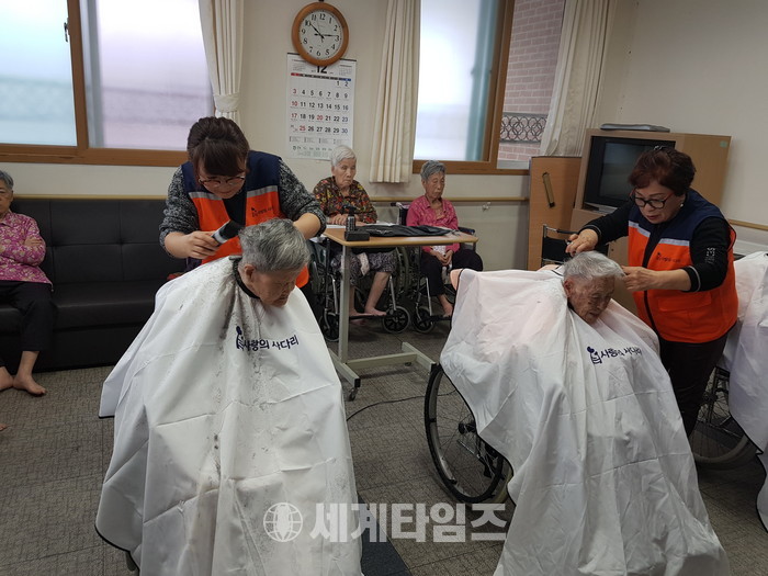 이날 미용봉사에는 권순분, 추병희 모녀 회원들과 송남석, 정영산, 조은숙 회원들이 3층과 4층에서 미용봉사를 하였다.