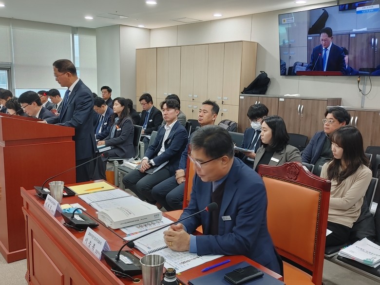 | ▲업무 보고 발표하는 이재준 대표이사 및 피감 관계자들 모습. |