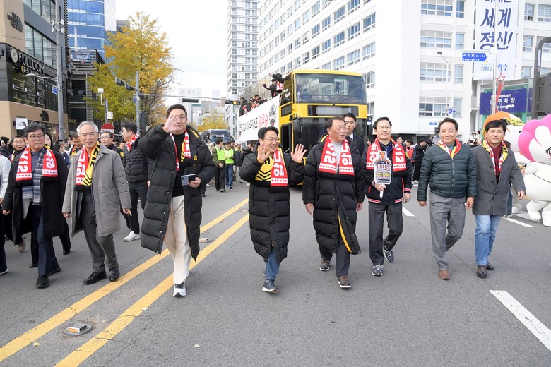 선수단은 사면이 개방된 2층 버스에 올라 시민들에게 감사 인사를 전했다. 강기정 시장과 시민들은 퍼레이드 차량 주변에서 도보 행진하며 축하했다.