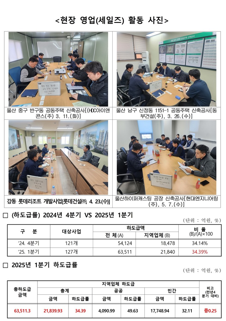 울산시는 하도급률이 저조한 주요 공공 및 민간 공동주택 건설 현장 60개소를 중점 영업활동 대상으로 선정하고, 하도급 발주 실태 조사, 지역업체 참여 유도, 제도 홍보 등을 집중적으로 추진했다.