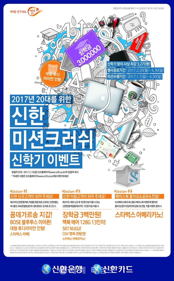 두번째 ‘이용이벤트 미션’은 ▲체크카드 최초신규 후 5만원 이상 이용하거나 ▲학생증체크카드를 1만원 이상 사용하면 되고, 장학금 3백만원(1명), 맥북에어(1명), SKT NUGU(3명), CGV기프티콘2매(200명), 스타벅스 기프티콘(1,000명)이 제공된다.