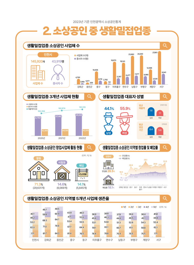 소상공인 통계는 2023년 12월 31일 기준으로 인천시 관내 소상공인의 사업체 규모, 매출, 고용, 업종별 현황 등을 종합적으로 분석한 지역통계다.