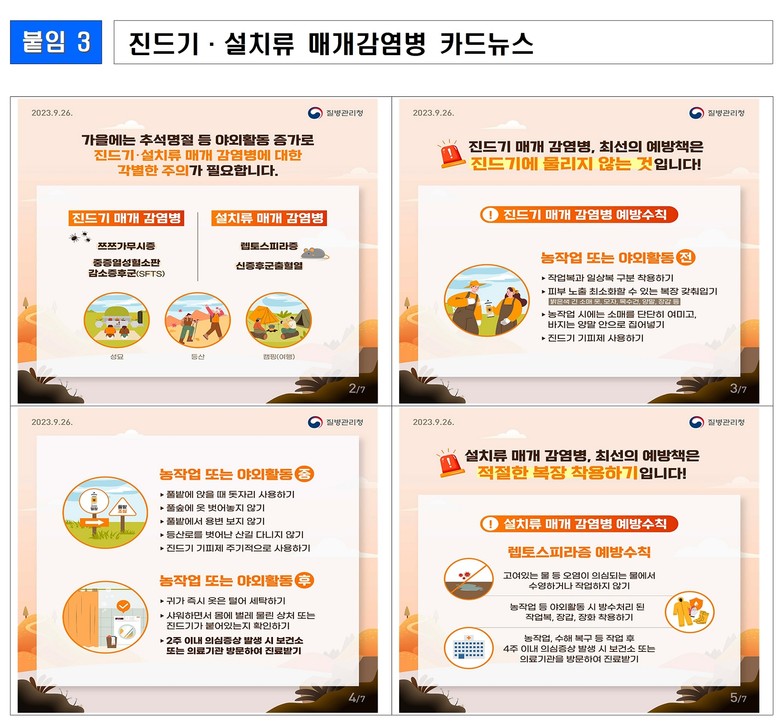 울산시에 따르면 국내 주요 진드기 매개 감염병인 쯔쯔가무시증과 중증열성혈소판감소증후군(SFTS)의 경우 최근 3년간(2022~2024년) 환자의 74.3%가 9~11월 사이에 집중 발생했다.
