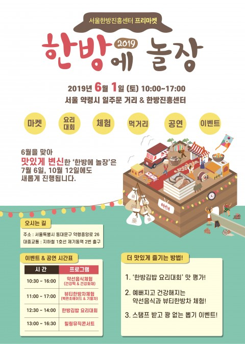 다채로운 한방프로그램으로 총 4회에 걸쳐 진행되는 서울한방진흥센터 프리마켓 ‘2019 한방에 놀장(場)’은 5월 4일(토) ‘어린이날 한방운동회’를 시작으로 6월 1일(토)은 ‘약선음식체험’, 7월 6일(토)은 ‘시원한방 여름축제’, 10월 12일(토)은 ‘한방문화축제와 함께 하는 프리마켓’을 주제로 서울약령시 일주문 거리와 서울한방진흥센터 내·외부 일대에서 펼쳐지며 이날은 서울약령시한의약박물관이 전면 무료 개방된다.