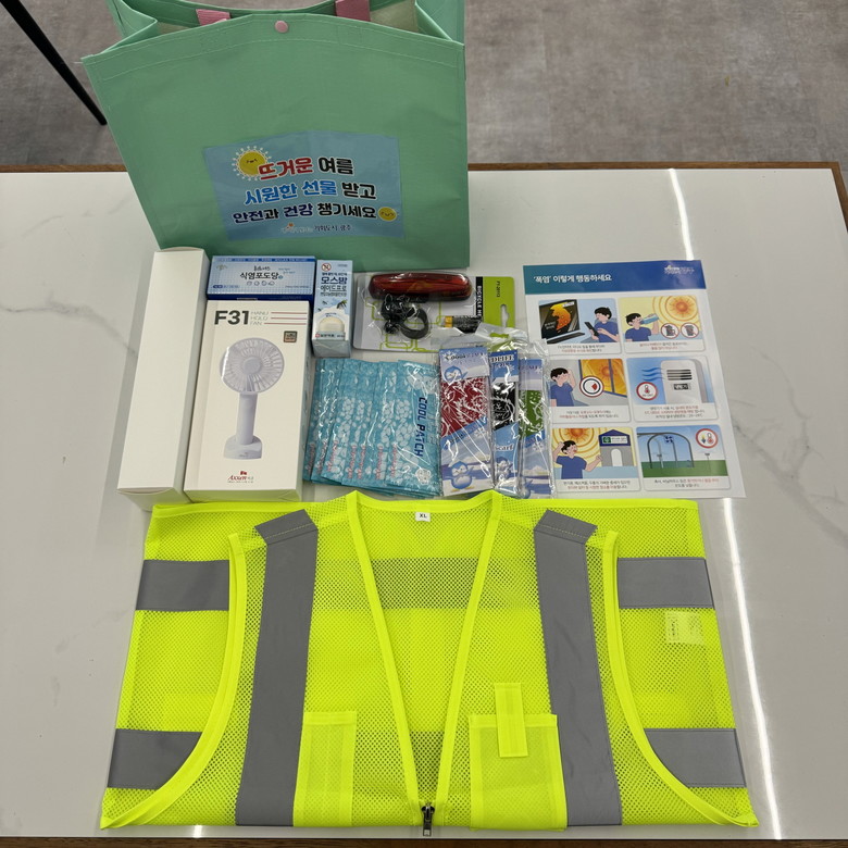 ‘폭염 안전물품 꾸러미’는 재사용이 가능한 가방에 휴대용 선풍기, 형광 망사 안전조끼, 양우산, 쿨스카프, 쿨패치, 벌레약, 식염포도당, 자전거 후미등 등 9가지 물품과 폭염 행동요령 소책자가 담겨있다.