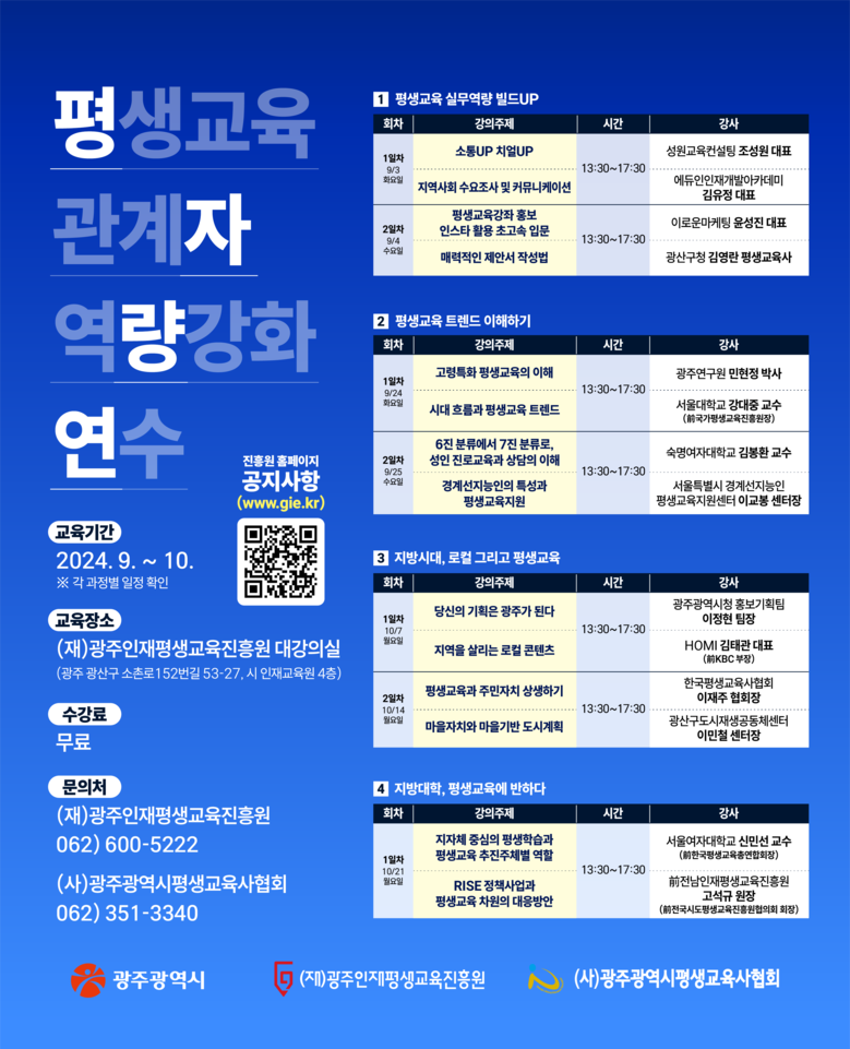 이번 연수는 광주시와 진흥원이 주최하고 (사)광주광역시평생교육사협회 주관으로 진행된다. 평생교육 실무역량부터 트렌드, 로컬, 대학 평생교육 등 분야별 전문가를 초빙해 4개 과정, 총 14차시 교육이 운영될 예정이다.