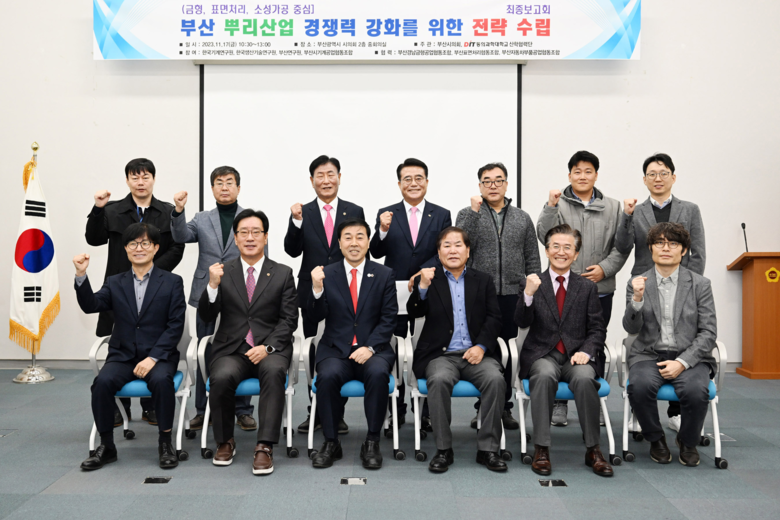 뿌리산업 연구모임은 17일(금) 오전 10시 30분 부산시의회 중회의실에서 「부산 뿌리산업 경쟁력 강화를 위한 전략 수립」연구용역 최종보고회를 열었다. 해당 연구는 뿌리산업 관련 국내·외 정책 동향을 분석하고, 부산시 뿌리산업 설문조사를 통해 업계 현황 및 뿌리산업 생태계를 분석하여 업종별 전략을 수립하고, 산업 경쟁력 강화를 위한 업종별 정책을 발굴하고자 하는 것으로 지난 7월 연구에 착수했다.