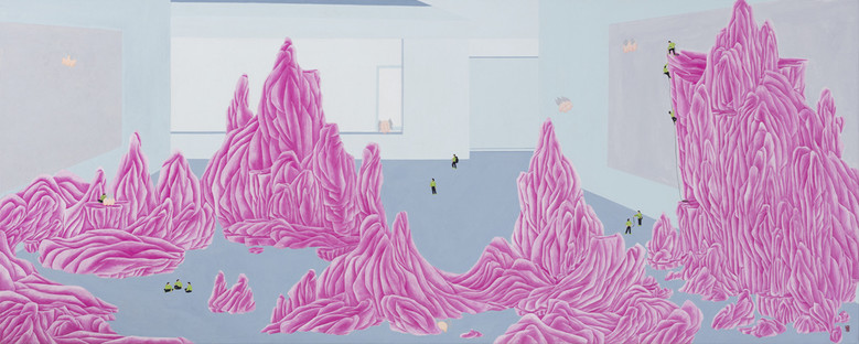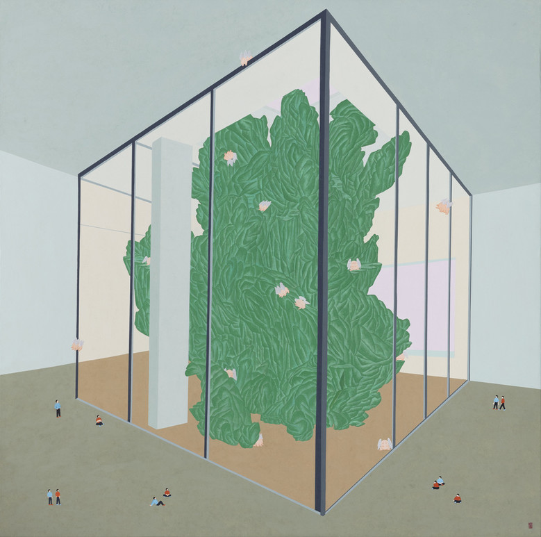 작품명 '眞境_탈각된 공간'은 그림 속 유리벽안의 산은 신성한 곳으로 소도와 같은 이 곳은 예술의 원천이 살아 숨 쉬는 공간으로 작가가 열망하는 세계로 표현하였다.