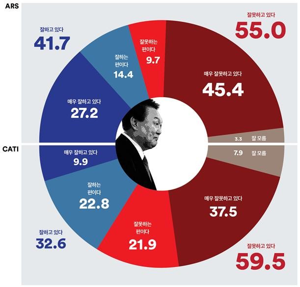윤석열 대통령의 국정운영 평가에 대한 전화면접조사 결과 ‘잘하고 있다’ 32.6%, ‘잘 못하고 있다’ 59.5%로 긍-부정의 격차가 26.9%p로 부정이 앞서는 것으로 조사됐다. ARS 조사 결과는 ‘잘하고 있다’ 41.7%,‘잘 못하고 있다’ 55.0%로 부정 평가가 13.3%p 더 높아 두 조사 모두 부정 평가가 우세한 것으로 나타났다.