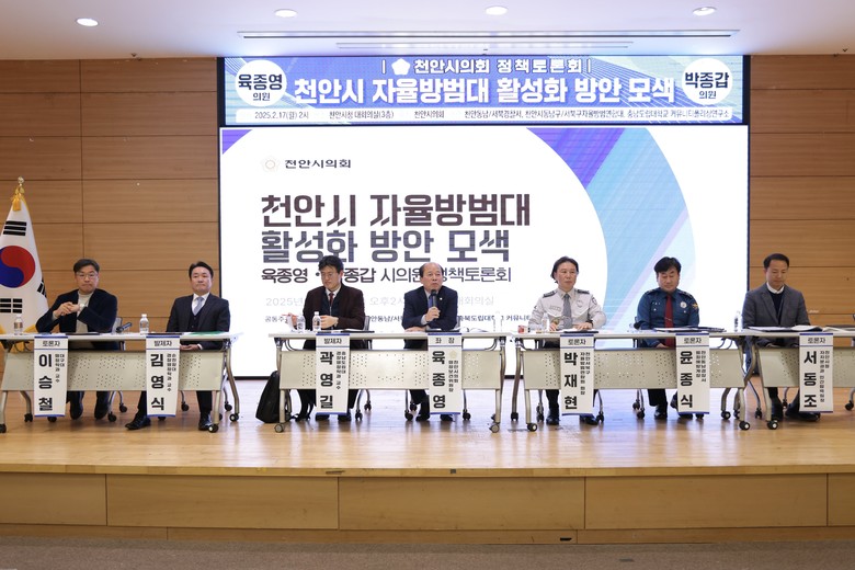 [천안시 세계타임즈=이현진 기자] 천안시의회(의장 김행금) 육종영 의원(더불어민주당, 성환읍・직산읍・입장면)과 박종갑 의원(더불어민주당, 풍세면・광덕면・신방동)이 지난 2월 17일 천안시청 대회의실에서 ‘천안시 자율방범대 활성화 방안 모색’ 정책토론회를 개최했다.