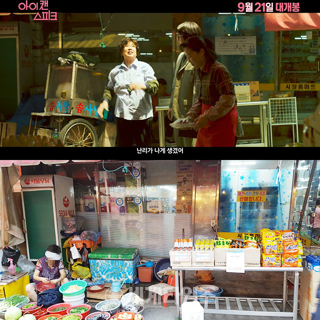 영화 '아이 캔 스피크' 메인 예고편에 극 중 '봉원시장', 실제 부산 '연산시장' 내 '시장홈마트'를 배경으로 나문희가 양복을 입은 남자에게 "난리가 나게 생겼어"라고 말하는 장면이 공개됐다.