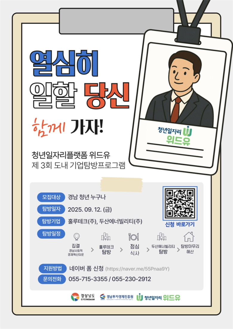 이 프로그램은 전액 무료로 운영된다. 청년일자리플랫폼 위드유(https://gnwithu.kr/) 홈페이지 내 큐알코드, 링크로 9월 2일까지 신청하면 되며 선착순 마감된다. 자세한 내용은 경남투자경제진흥원(055-715-3355)로 문의하면 된다.