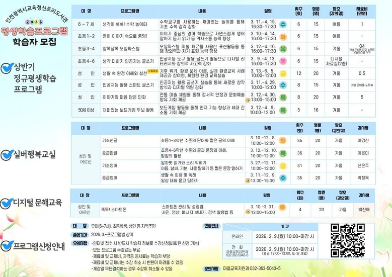 모집은 2월 9일 10시부터 신트리도서관 누리집에서 선착순 진행하며, 자세한 내용은 누리집을 확인하거나 마을교육지원과(☎ 032-363-5043~45)로 문의하면 된다.