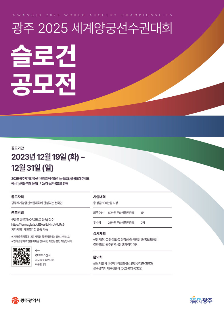 대회 성공 개최를 위한 첫 준비단계인 슬로건 공모전은 대회에 관심있는 누구나 참가 가능하며, 12월 31일까지 진행된다. 심사결과는 2024년 1월 중 광주시 누리집을 통해 공지될 예정이다.