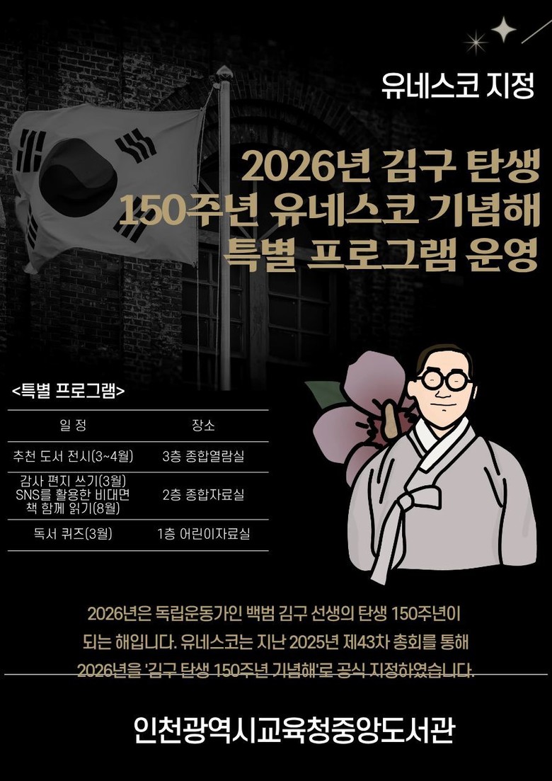 이번 행사는 백범 김구 선생과 관련한 ‘도서 전시’, ‘비대면 책 함께 읽기’, ‘어린이 독서 퀴즈’와 ‘김구 선생님께 감사 편지 쓰기’ 등으로 구성되어, 선생의 숭고한 생애와 애국정신을 시민이 일상 속에서 되새길 수 있도록 진행한다.