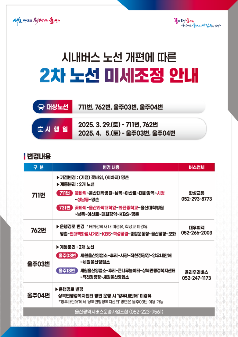2차 미세조정 대상 4개 노선 중 711번, 762번 2개 노선은 3월 29일(토)부터, 울주03번, 울주04번은 4월5일(토)부터 시행한다.