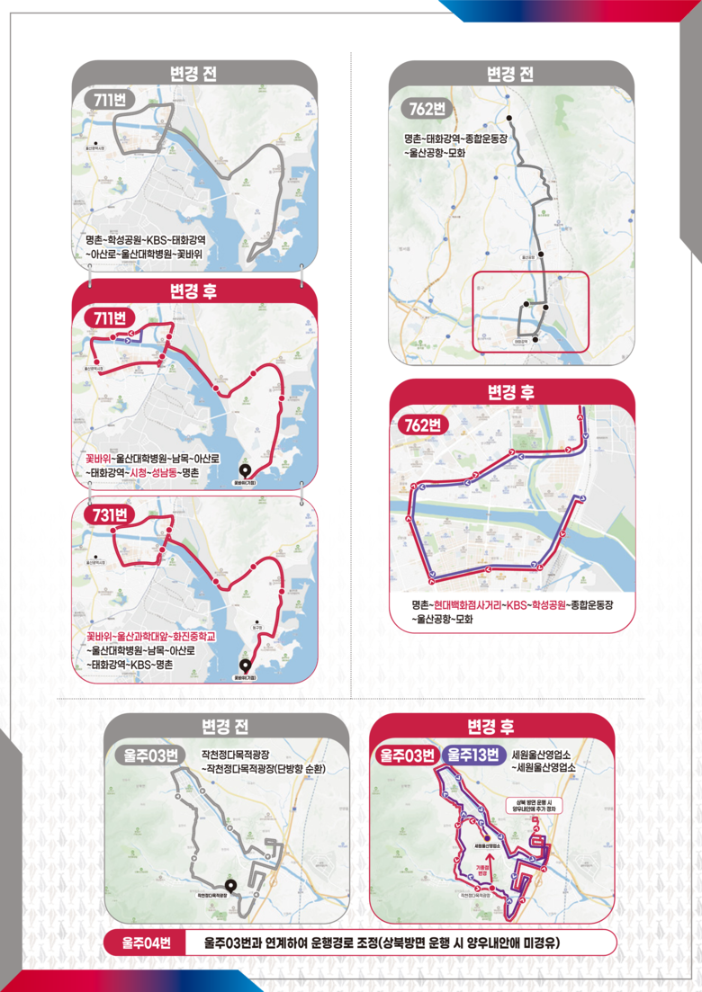 울주03번은 ‘세원울산영업소~후리~사광~작천정광장~양우내안애~세원울산영업소’ 경로로 운행하고, 울주13번은 ‘세원울산영업소~후리~큰나무놀이터~상북면행정복지센터~작천정광장~세원울산영업소’ 경로로 운행하게 된다. 울주03번은 ”양우내안애“ 아파트를 추가로 경유하게 된다.