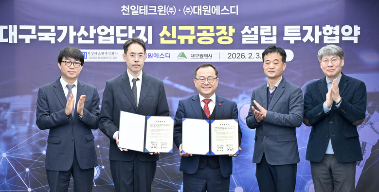 ▸ 지역 강소기업 ㈜대원에스디, 수주 증가에 따른 제조공장 신설 [대구 세계타임즈=한윤석 기자] 대구광역시는 2월 3일(화) 오전 11시, 시청 산격청사에서 천일테크윈㈜(대표 박준서), ㈜대원에스디(대표 신재호)와 대구국가산업단지 내 신규 제조공장 설립을 위한 투자협약을 체결했다.