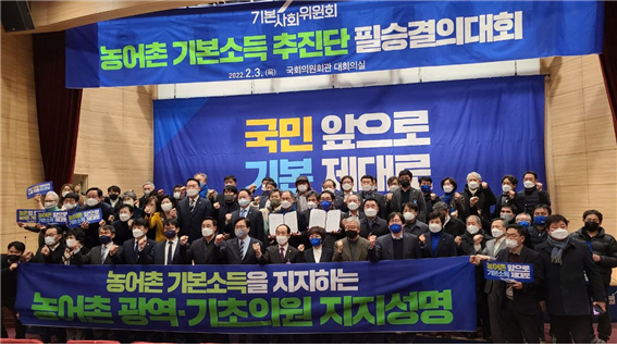 강원과 경기, 영남, 호남 8개 지역 광역.기초의회 의원 1,000여명은 3일 국회 대회의실에서 더불어민주당 이재명 대선후보의 대표공약인 농어촌기본소득을 환영하는 성명을 발표하고 대선 승리를 결의했다.