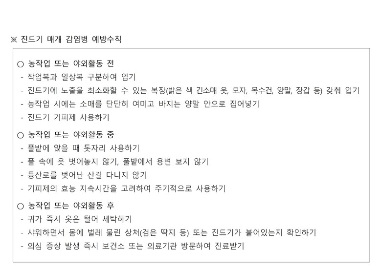 특히 두피, 귀 뒤나 안쪽, 겨드랑이와 발가락 사이 등 확인이 쉽지 않은 사례들이 있는 만큼 야외활동 후에는 몸에 진드기가 붙어 있는지 꼼꼼히 확인해야 한다.