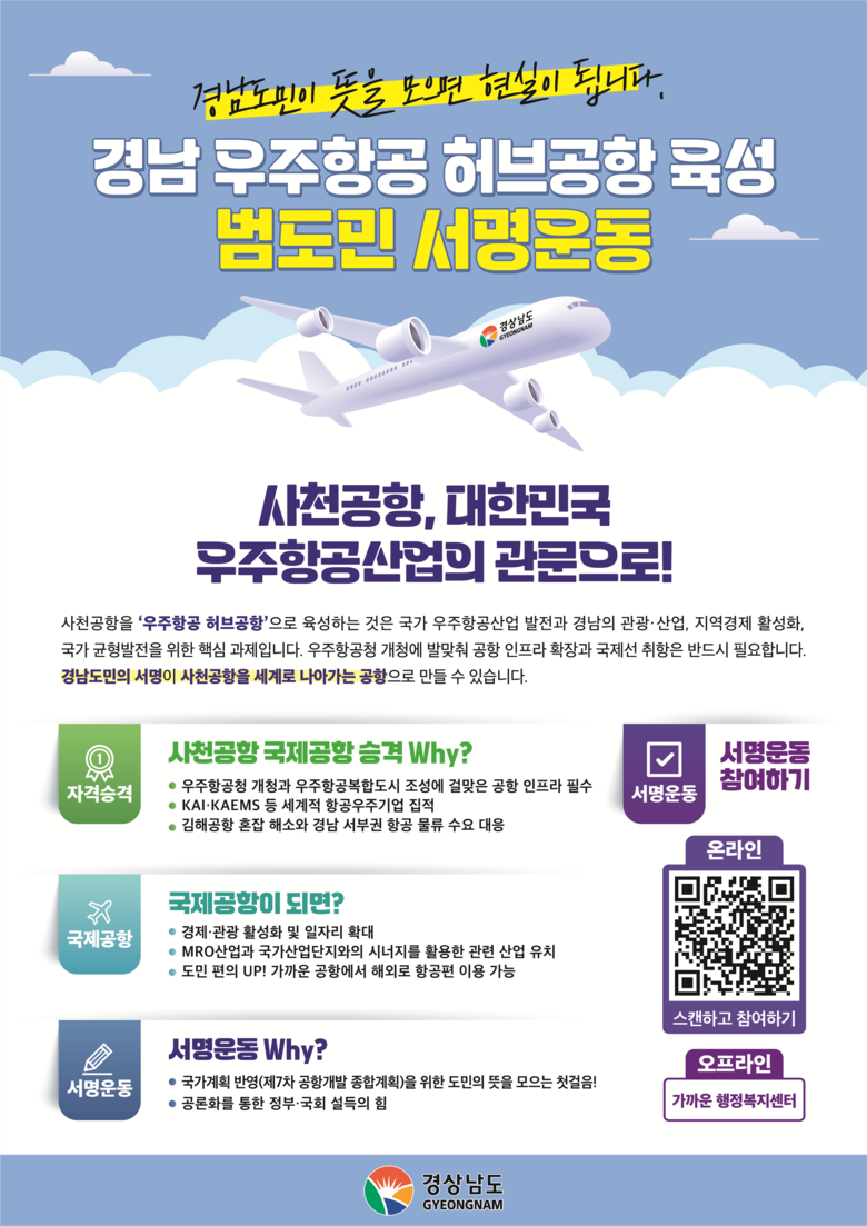 경남도 박성준 교통건설국장은 “이번 서명운동은 사천공항이 미래 우주항공산업의 하늘길 관문으로 도약하는 데 있어 도민의 의지를 결집하는 중요한 계기가 될 것”이라며, “도민 여러분의 적극적인 참여와 관심을 부탁드린다”고 말했다.