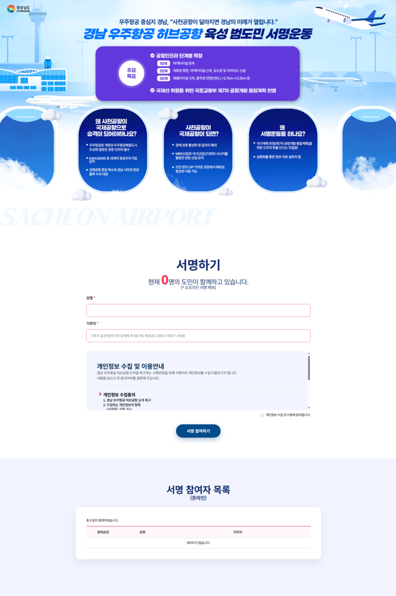 이번 서명운동은 도민의 염원을 하나로 모아, 국토교통부가 수립 중인 「제7차 공항개발 종합계획('26~'30)」에 사천공항의 단계별 인프라 확장과 국제선 취항 반영을 촉구하기 위해 추진됐다.