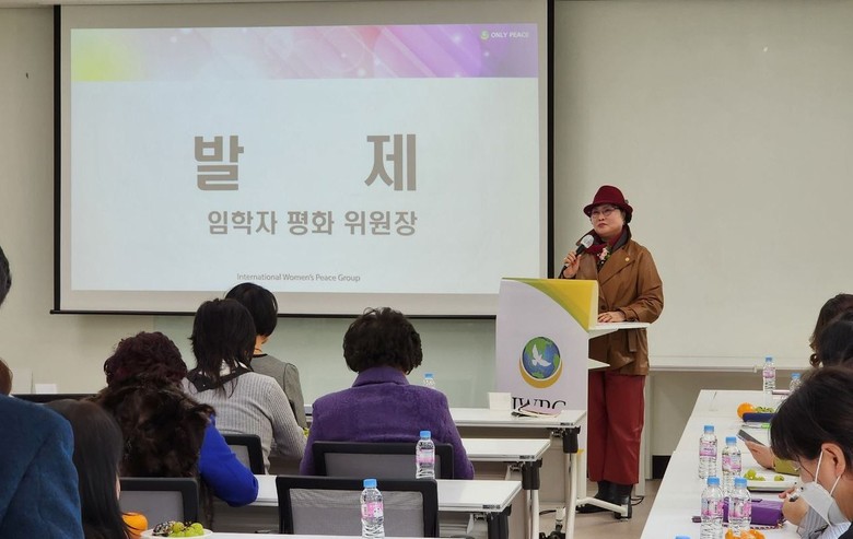 | ▲‘온리피스 콘퍼런스’에서 임학자평화위원장이 발제를 하고 있다. |
