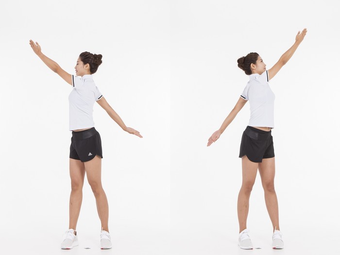 이럴 때는 ‘쭉쭉 찍고 스트레칭’이 효과적이다. 허리를 최대한 비틀면서 양팔을 좌우 번갈아 위로 쭉쭉 아래로 쭉쭉 뻗는 동작을 반복한다. 시선은 손끝에 고정한다. 상체와 하체 모두 스트레칭할 수 있어 전신 운동 효과를 볼 수 있다. [세계타임즈 조원익 기자]