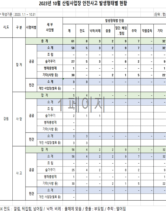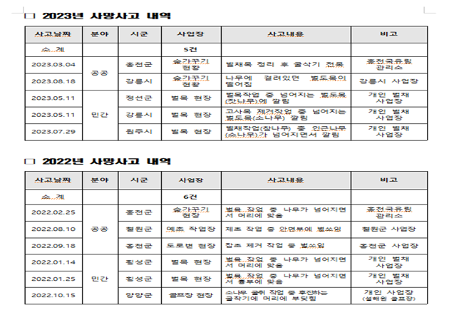 특히, 사망사고 발생 현황을 보면 △20년 5건 △21년 4건 △22년 6건이며, 올해는 10월 현재 5건이 확인되어 사망사고가 지속적으로 발생하고 있다. 내용을 보면 민간 벌목 현장에서 나무가 넘어지면서 발생한 사고가 3건, 공공 숲 가꾸기 현장에서 굴삭기 전복 및 벌도목 떨어짐 사고가 2건이다.