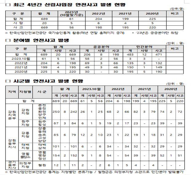 분야별 안전사고 현황을 보면 공공분야에서 발생한 사고는 △20년 30건 △21년 49건 △22년 69건, 23년 10월 현재 58건이며, 민간 분야는 △20년 195건 △21년 150건 △22년 135건으로, 23년 현황은 한국산업안전보건공단 통계를 통해 내년 초 집계가 완료될 예정이다.