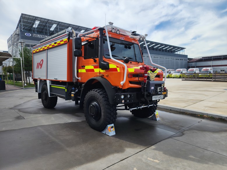 험지펌프차는 물 3300L를 싣고 45도 경사를 오를 수 있다. 고압호스릴이 장착돼 있고 주행 중 방수도 가능해 신속한 화재 진압과 산불 진압에 효과적이다. 특히 높은 차륜과 상부 배기구로 수심 1.2m까지 주행할 수 있어 수해지역 인명구조 활동도 가능하다. 또 전천후 4륜구동형 차량으로 일반차량의 접근이 어려운 재난지역에서 다양한 임무를 수행할 수 있다.