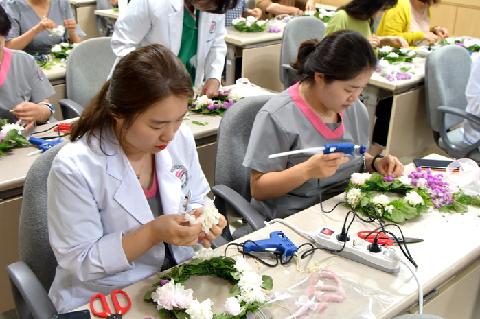 행사는 지난달 ‘2019 마음건강 프로젝트’에서 스트레스 측정 수치가 높게 나온 직원들을 주 대상으로 진행됐다. 참가자들은 병원 보건관리자와 외부강사의 지도하에 생화를 말린 프리저브드 플라워와 조화를 이용한 리스를 만들었다.