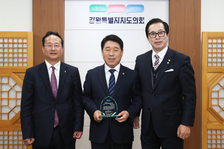 글로벌뉴스통신 김용기 경영본부장이 지난 4일에 강원특별자치도의회 의장실에서 2023 대한민국 글로벌 브랜드대상 지방자치부문 대상을 전수했다. 권혁열 강원특별자치도의회 의장은 강릉 출신으로 제8대·9대·11대 의원(3선)으로 강원특별자치도민 소통과 화합으로 생활정치 실천으로 인정받아 지방자치부문 대상을 수상했다.