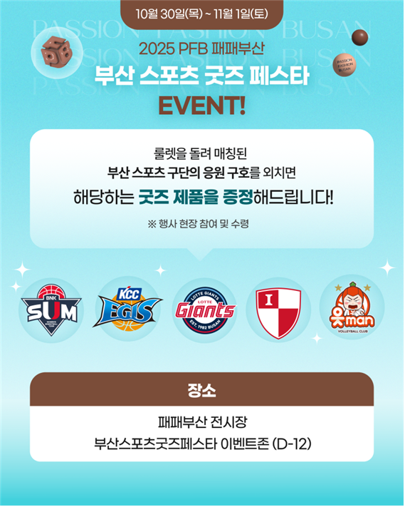 [특별 전시 공간(부스)] 부산 연고 프로스포츠 5개 구단이 한 공간에 참여하는 '통합 팬 컬처 존'으로, 각 구단의 ▲유니폼 ▲티셔츠 ▲모자 등 대표 패션 팬 상품(굿즈)을 한자리에서 만나볼 수 있으며, 큐알(QR) 코드를 활용한 온라인 판매도 할 예정이다.