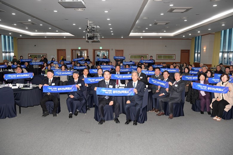 [광주 세계타임즈=손권일 기자] 김영문 광주광역시 문화경제부시장이 21일 오전 광주테크노파크 국제회의실에서 열린 제273회 산학협동포럼에 참석해 참석자들과 함께 창립23주년 축하떡을 자른 뒤 기념촬영을 하고 있다. /광주광역시 제공